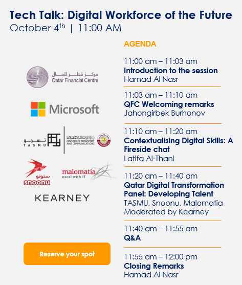Tech Talk entitled, “Digital Workforce of the Future,” held in partnership with Kearney Consulting. The event will provide insights into the latest developments in the global as well as Qatar’s digital workforce landscape and the implications for Qatar’s labour market.